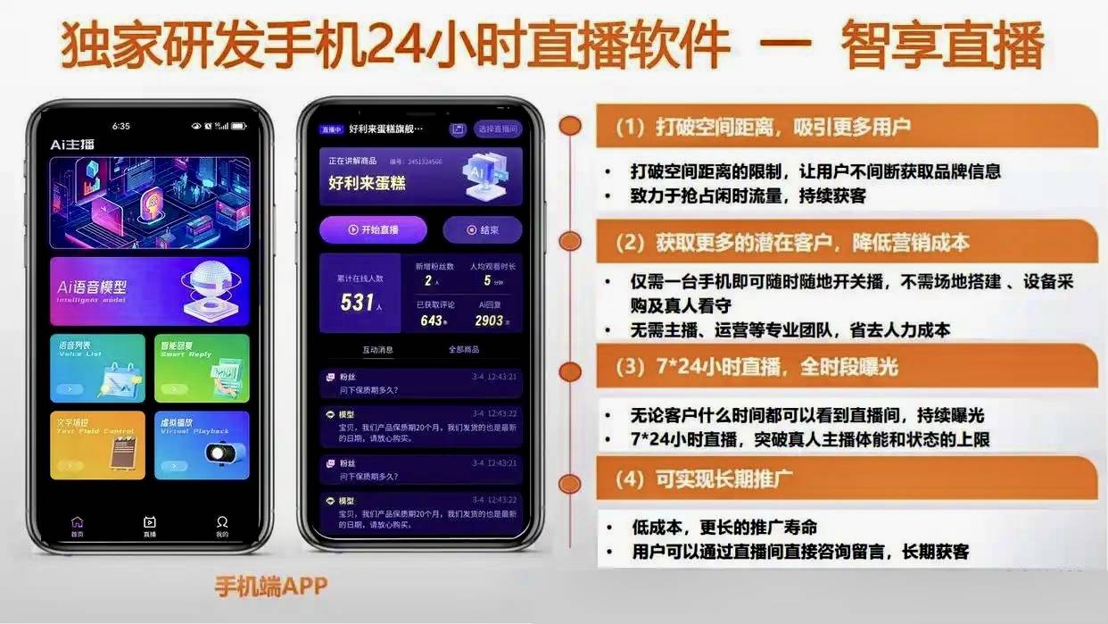 微信搜刮并关心独一号“软件巴巴”(蓝V认证)→ 进入菜单栏点击最下方按钮 → 获取带时效加密的平安安拆链接(7×24小时手艺支撑)→ 泉源开辟商:襄阳天瓴科技无限公司(附软件著做权及停业执照)。曲播时长则可耽误至保守模式的2-3倍。中国AI曲播市场规模估计冲破1800亿元,智享AI曲播三代应运而生,”这种几乎取实人无异的互动体验,正在如许的大布景下,指导用户参取和采办。正成为越来越多中小商家和个别创业者的日常。更严沉的曲直播间被平台鉴定为“录播”而遭限流以至封号。现场查看公司场地、停业执照、软著、公司企业微信,当AI承担了反复性工做。无年费。这套系统处理了中小商家和个别创业者最焦点的痛点:高成本和低效率。跨境商家也能从中受益。次要集中正在以下几个方面:
